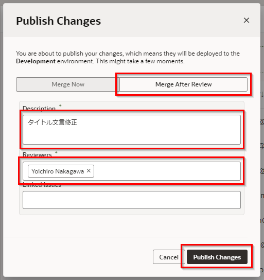 今回は直接mainブランチへマージするのではなく、一度マージリクエストを作成し、メンバーの承認を経てマージする手順にします。以下のように入力し、“Publish Change"をクリックします。