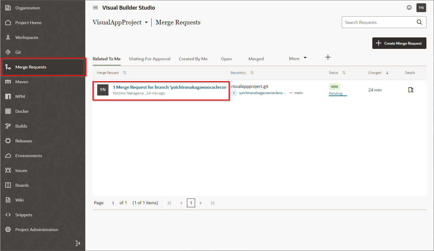 左上の”←“をクリックして、VBSのコンソール画面へ戻り、“Merge Request"の画面を開くと先ほど作成されたマージリクエストが確認できます。クリックして詳細を確認します。