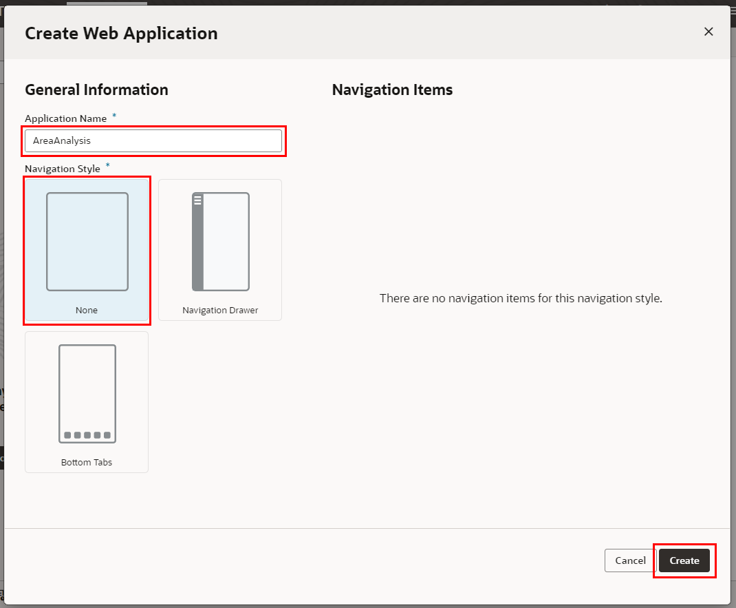 「Create Web Application」 ダイアログ・ボックスが表示されたら、 「Application Name」 フィールドに 「AreaAnalysis」 と入力し、 Navigation Style に 「None」 を選択し、 「Create」 ボタンをクリックします。