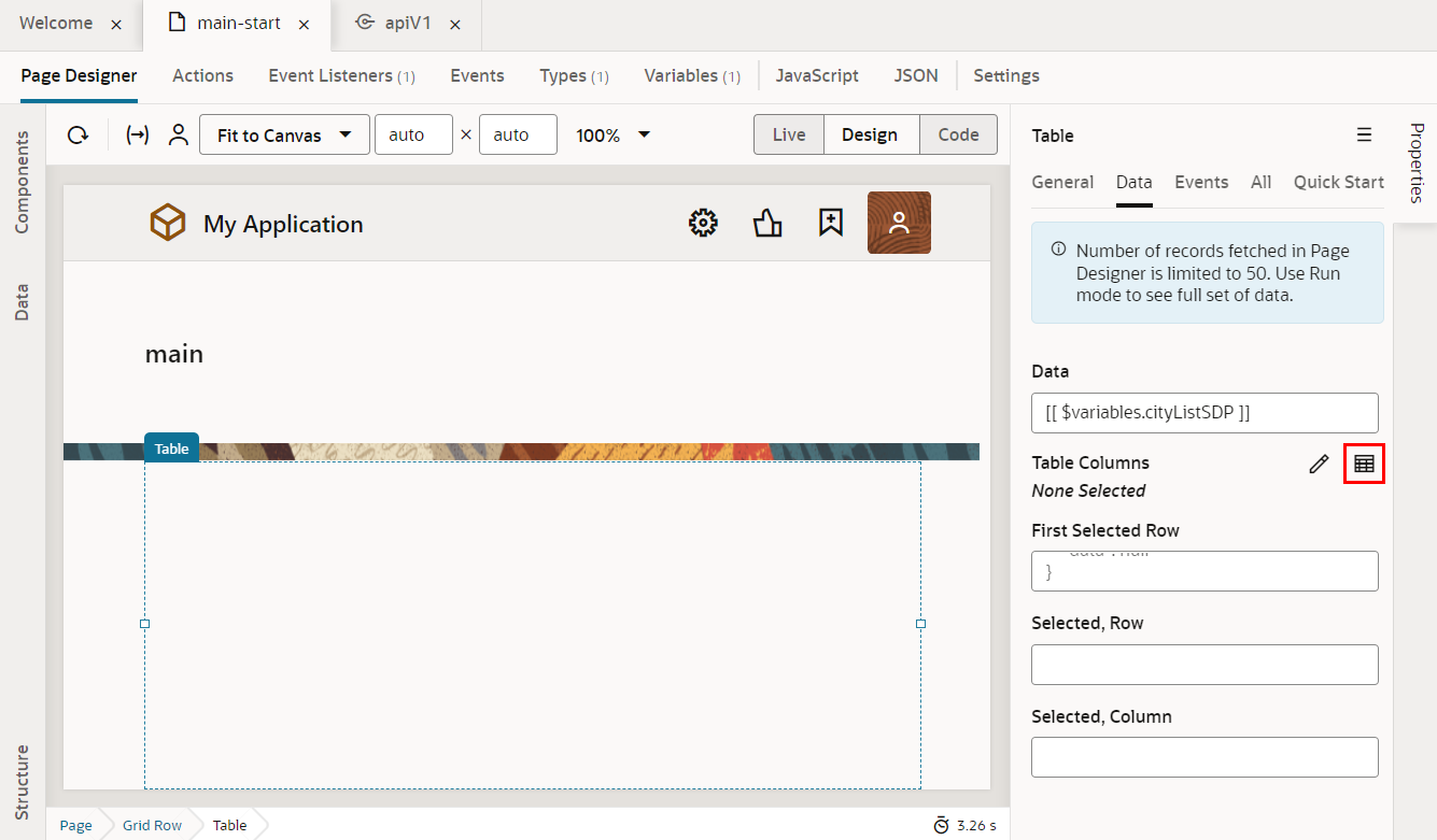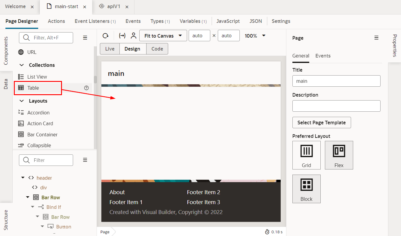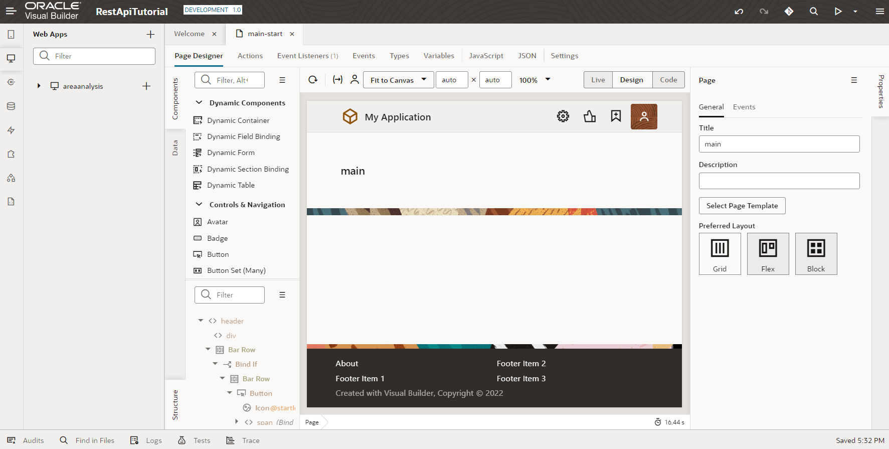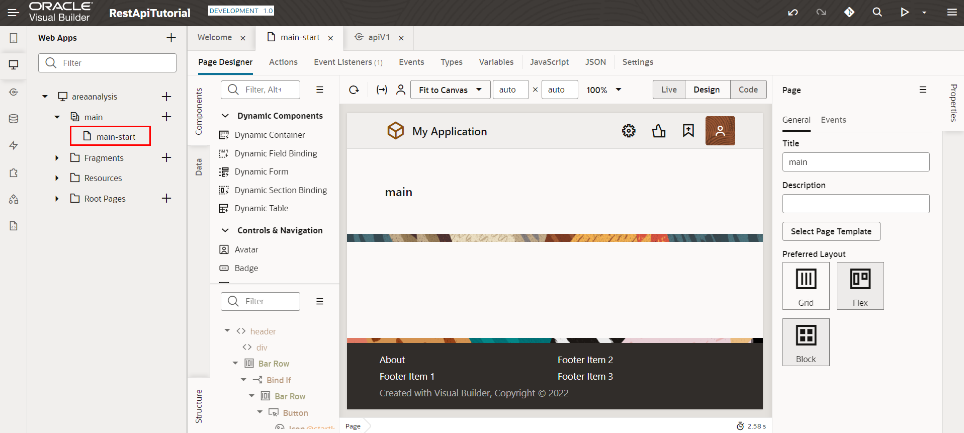 アーティファクト・ブラウザの 「Web Applications」 タブ を開きます。 「main」 ノードを展開し、「main-start」 をクリックします。 アプリケーション・デザイナで main-start ページが表示されます。