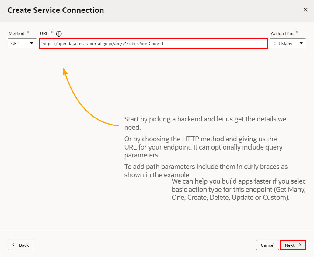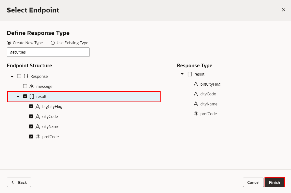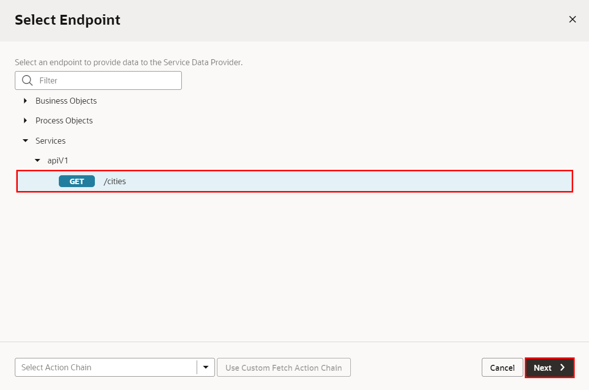 「Select Endpoint」 ダイアログ・ボックスで「Services」 →「前のパートで作成したサービス接続の名前(ここでは、apiV1)」 → 「GET /cities」を選択して、「Next > 」 ボタンをクリックします。