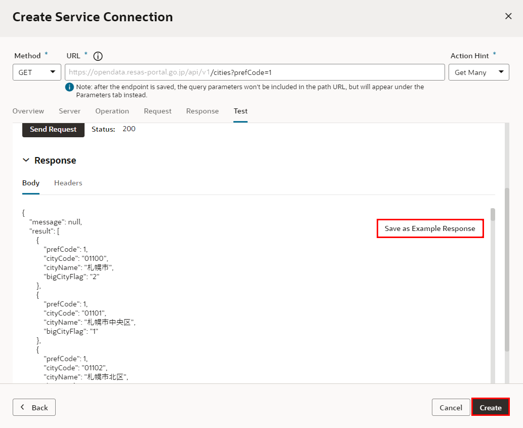 レスポンスが表示されたら、「Save as Example Response」ボタンをクリックし、「Create」ボタンをクリックします。