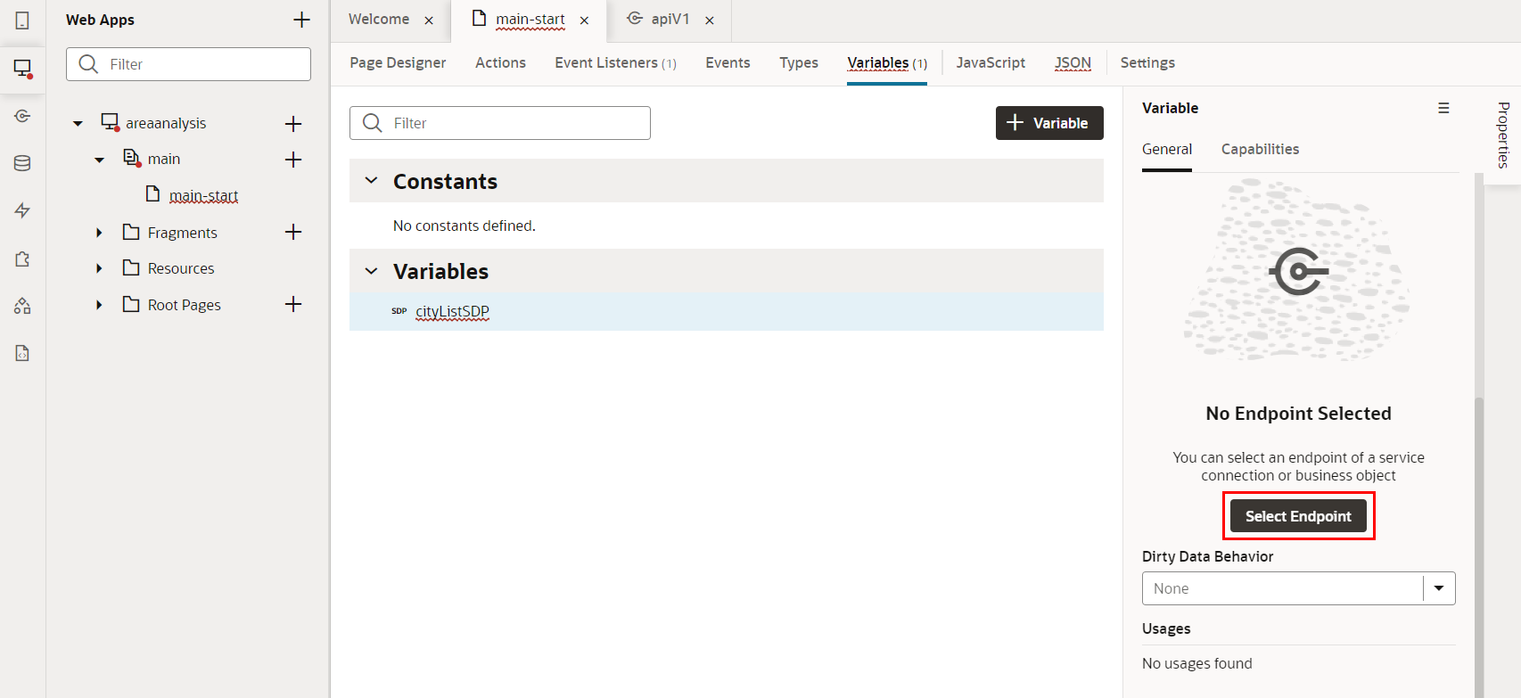 変数「cityListSDP」が作成され、アプリケーション・デザイナで表示されます。プロパティ・インスペクタで、 「Select Endpoint」 ボタンをクリックします。