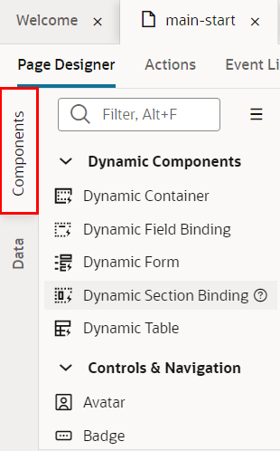 アプリケーション・デザイナの左側には、コンポーネント・パレットが表示されます。 コンポーネント・パレットは、デザイナの左にある コンポーネントタブで表示/非表示を切り替えることができます。
