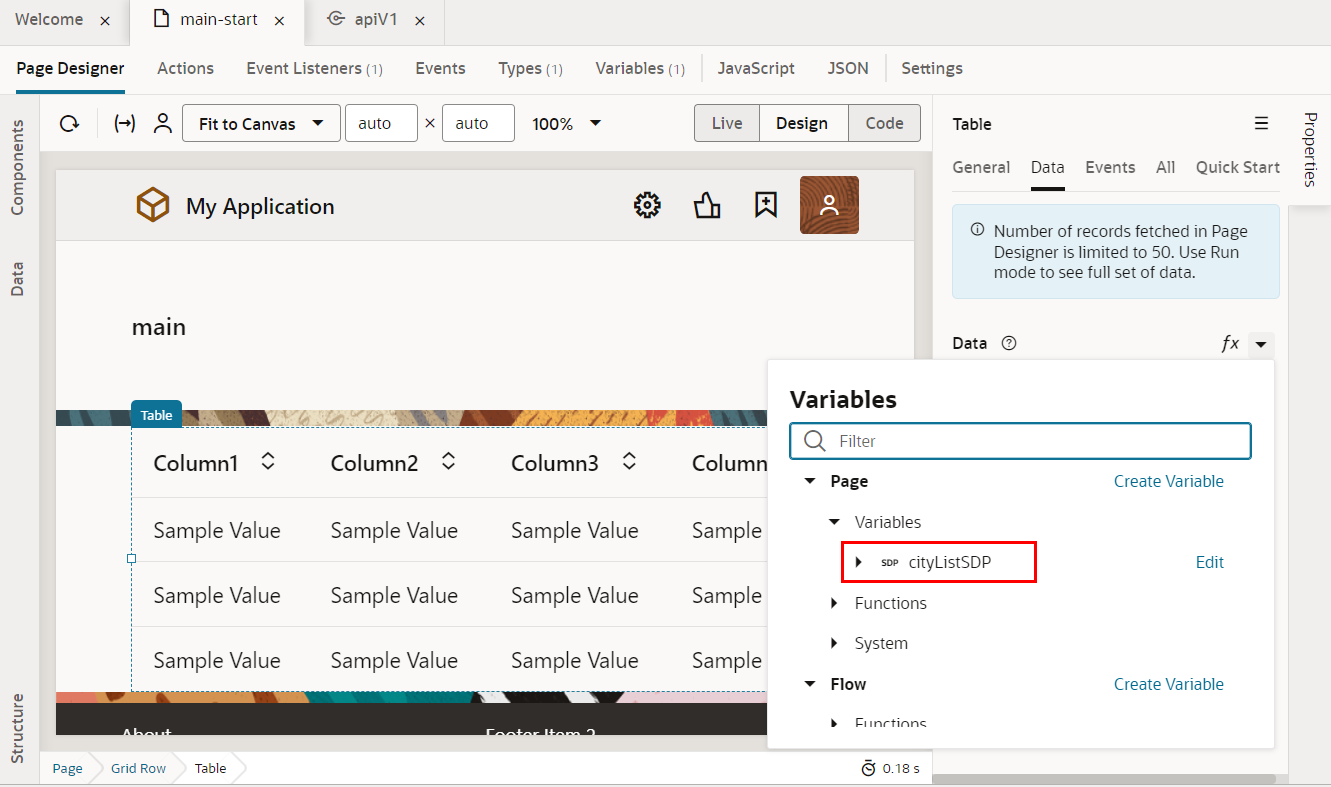 アプリケーション・デザイナの Variables タブをクリックします。 「+ Variable」 ボタンをクリックします。