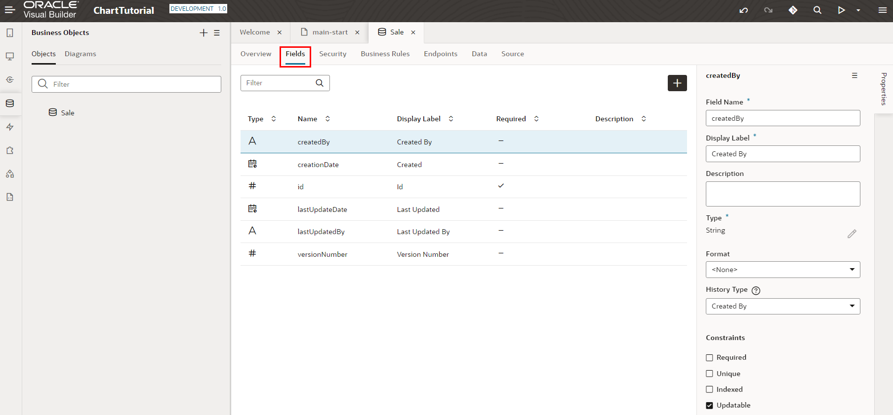 ビジネス・オブジェクトが作成されたら、 「Fields」 タブをクリックします。 6つのフィールドが定義されています。