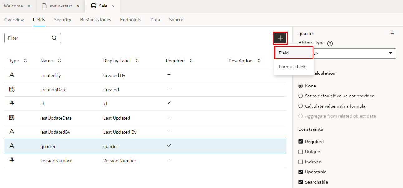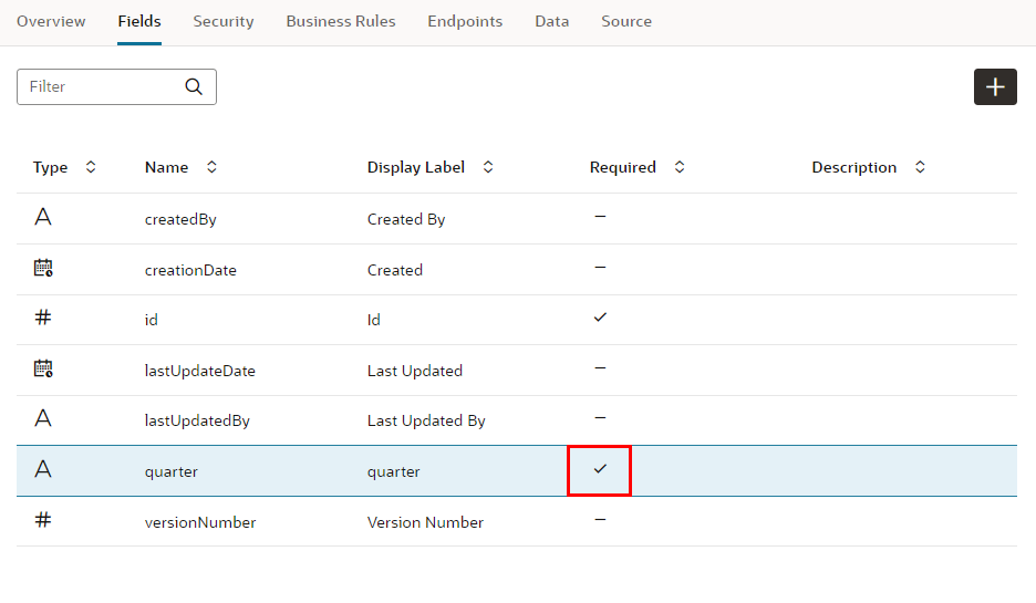 プロパティ・エディタで 「Required」 をチェックすると、フィールド quarter は必須データ項目に設定されます。 レコードの作成や編集フォームで、値が入力されているかどうか自動的にチェックされるようになります。フィールドquarterの「Required」 列にチェック・マークが表示されていることを確認します。