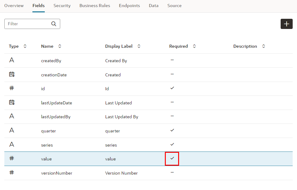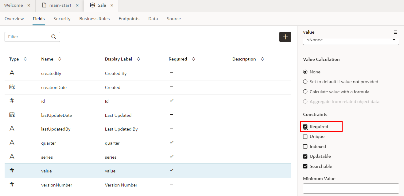 プロパティ・エディタで 「Required」 をチェックすると、フィールドvalueは必須データ項目に設定されます。 レコードの作成や編集フォームで、値が入力されているかどうか自動的にチェックされるようになります。フィールドvalueの「Required」 列にチェック・マークが表示されていることを確認します。