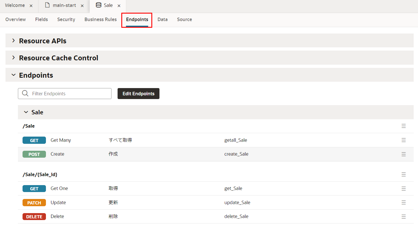「Endpoints」 タブ・ページを開くと、このビジネス・オブジェクトのデータの参照、作成、更新、削除のための REST API のエンドポイントが一覧できます。