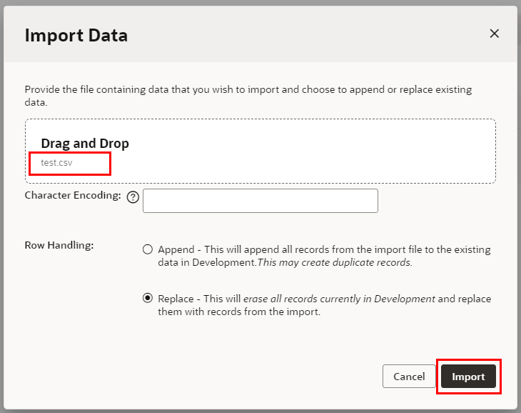 「Import Data」 ダイアログ・ボックスが表示されます。 「Drag and Drop」 と書かれたボックスをクリックするとファイルを開くウィンドウが表示されるので、ダウンロードしたtest.csvを開き(またはドラッグ&ドロップ)、 「Import」 ボタンをクリックします。