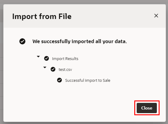 「Import from File」 ダイアログ・ボックスにインポートが成功したことを表すメッセージが表示されたら、 「Close」 ボタンをクリックします。
