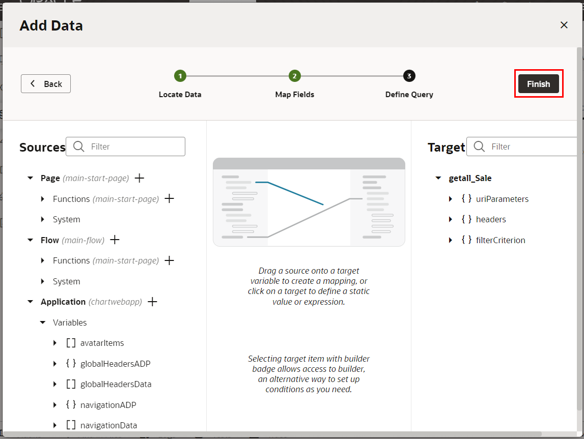「Add Data」ダイアログ・ボックスの 「Define Query」 ページでは、そのまま 「Finish」 ボタンをクリックします。