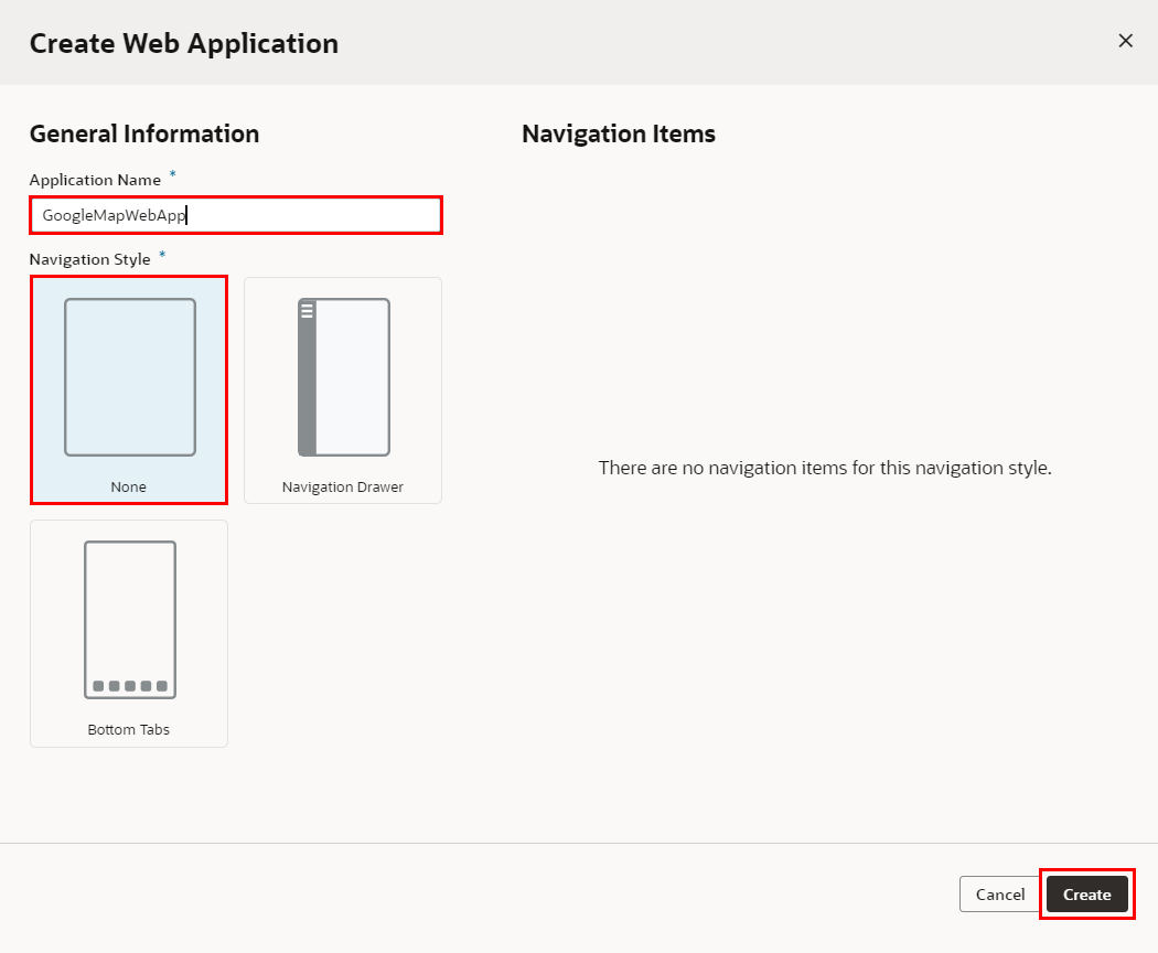「Create Web Application」ダイアログ・ボックスが表示されたら、「Application Name」フィールドに「GoogleMapWebApp」と入力し、Navigation Styleに「None」を選択し、「Create」ボタンをクリックします。