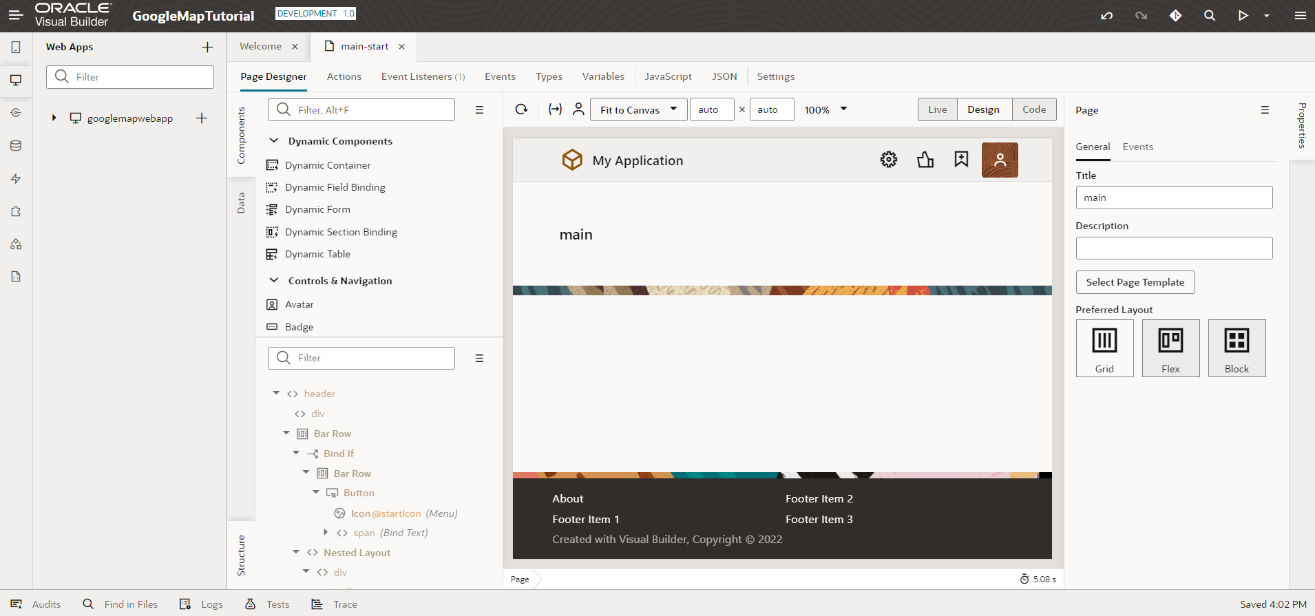 GoogleMapWebAppアプリケーションのアーティファクトが生成されます。ページ・デザイナで表示されている「main-start」が、アプリケーションの起動時に最初に表示される画面です。