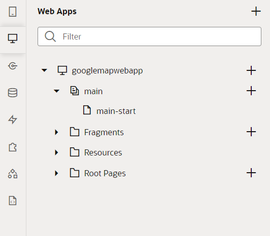 アーティファクト・ブラウザで「googlemapwebapp」ノードを展開するとWebアプリケーションの構造が表示されます。「main」ノードを展開すると「main-start」ページが表示されます。