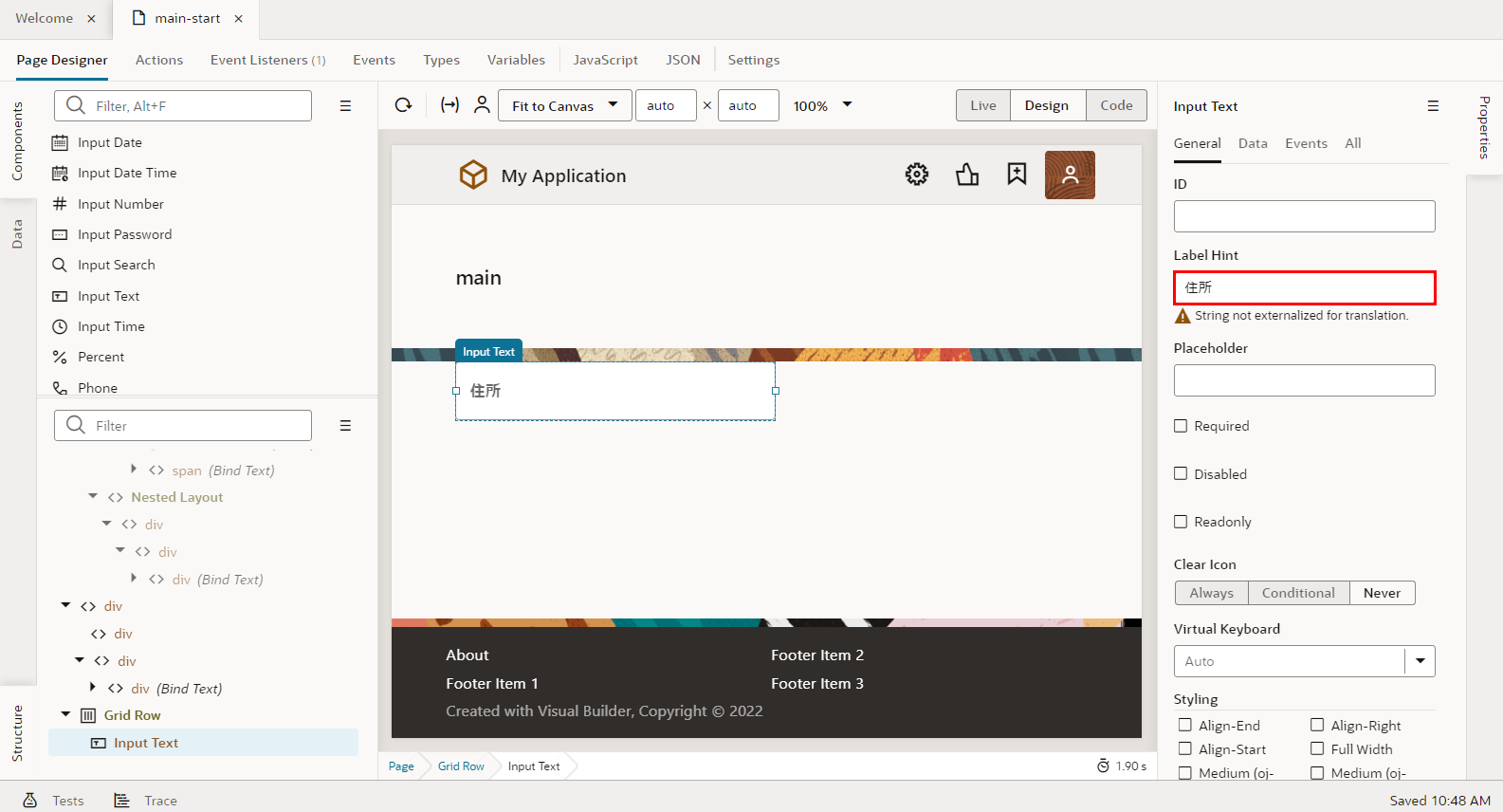 追加されたInput Textコンポーネントのプロパティ・インスペクタで「Label Hint」フィールドに「住所」と入力します。