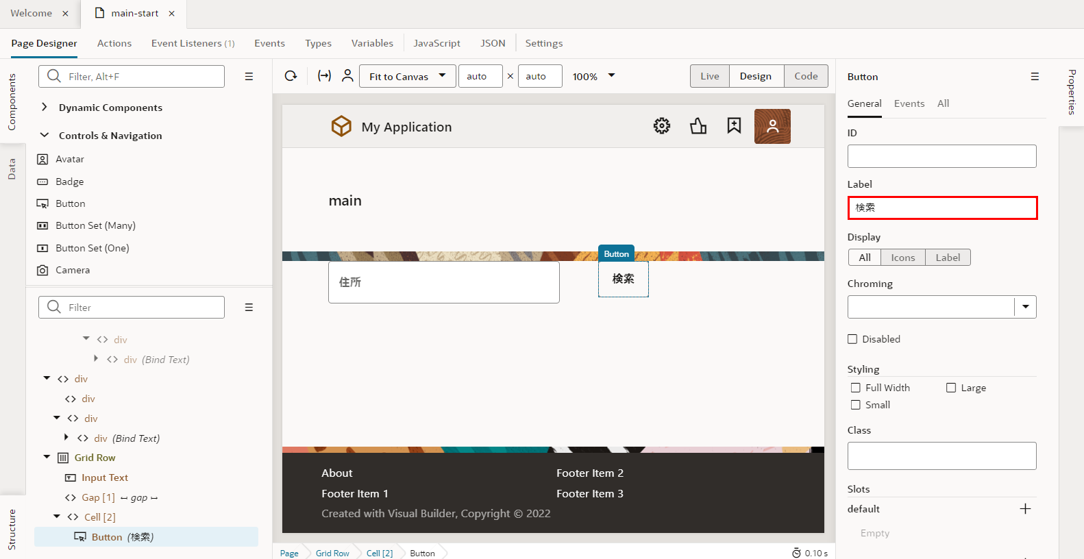追加されたButtonコンポーネントのプロパティ・インスペクタで「Label」フィールドに「検索」と入力します。