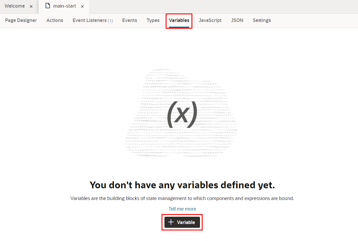 アプリケーション・デザイナの「Variables」タブをクリックします。「+ Variable」ボタンをクリックします。