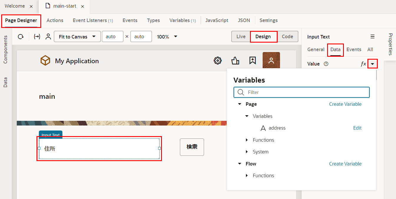 「Page Designer」タブを開き、「Design」ボタンをクリックして、デザイン・モードに切り替えます。Input Textコンポーネントを選択します。Input Textコンポーネントのプロパティ・インスペクタでDataタブを開きます。「Value」フィールドにカーソルを合わせて、「▼」をクリックします。