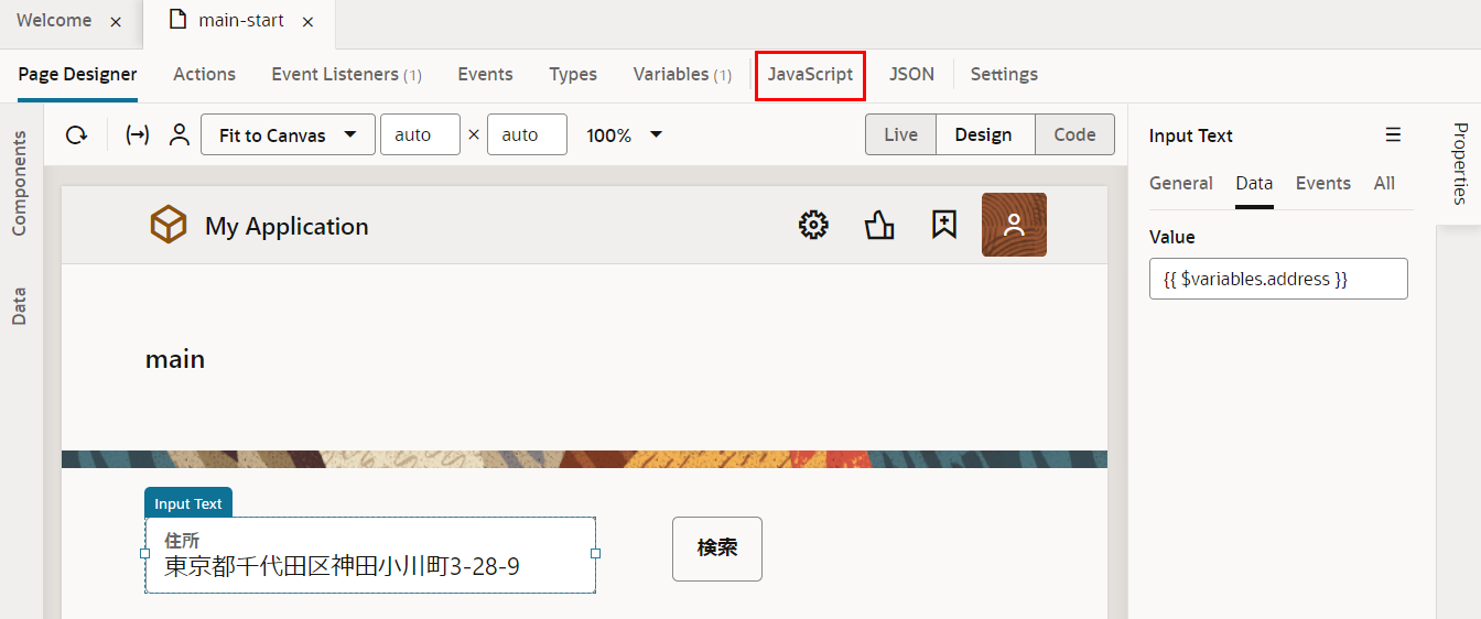 変数「address」のプロパティ・インスペクタで「Default Value」フィールドに「東京都千代田区神田小川町3-28-9」と入力します。