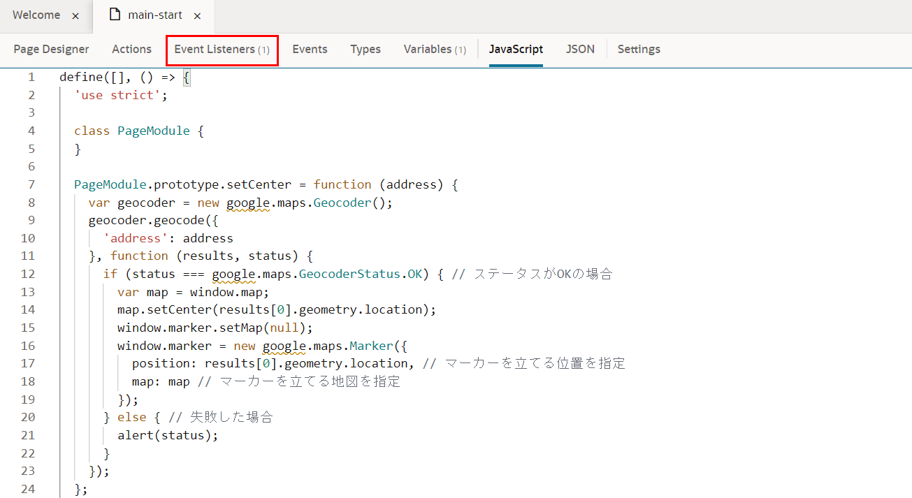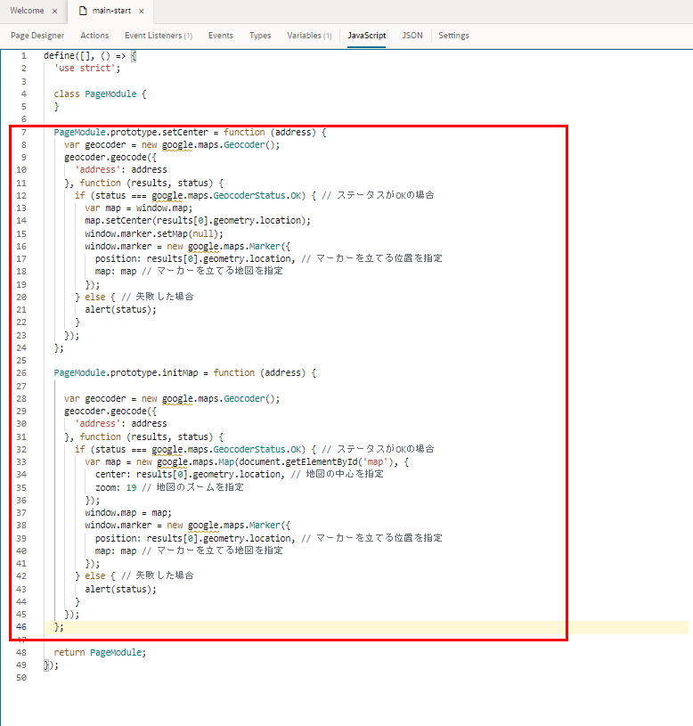 このパートでは、main-startページを編集して、テキストボックスに入力された住所の値を基に地図上にピンマークを設置します。