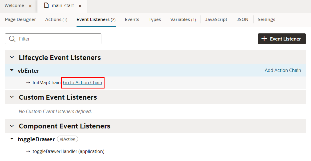 ビジュアル・アプリケーションが作成されると、VBCSのアプリケーション・デザイナでビジュアル・アプリケーションがオープンします。アプリケーション・デザイナにはアーティファクト・ブラウザとWelcomeスクリーンが表示されます。Welcomeスクリーンには、VBCSでアプリケーションを作成するためのタスクのガイドが表示されます。