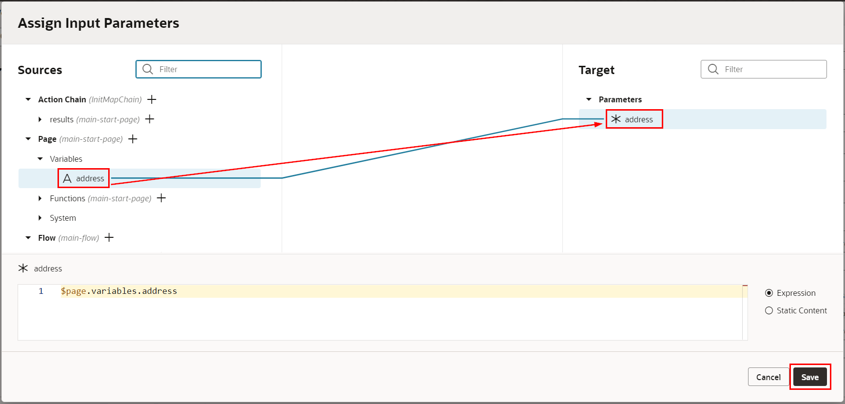 「Assign Input Parameters」ダイアログ・ボックスが表示されます。「Sources」ペインの変数「address」を「Target」ペインのパラメータ「address」にドラッグし、「Save」ボタンをクリックします。