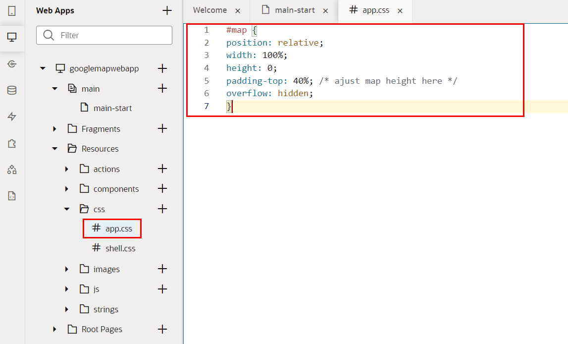 「googlemapwebapp」 → 「Resources」 → 「css」ノードを展開して、「app.css」を開きます。以下のCSSコードを追加します。