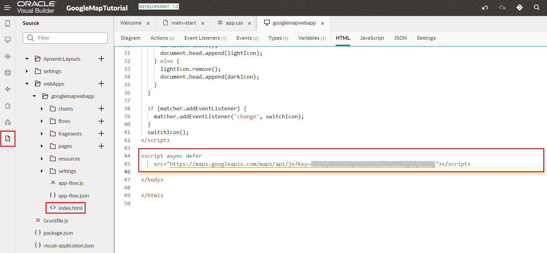 「Source View」タブをクリックします。「webApps」 → 「googlemapwebapp」 → 「index.html」を開き、以下のHTMLコードを追加します。<YOUR API KEY>の部分はご自身で取得したGoogleマップAPI KEYを入力してください。