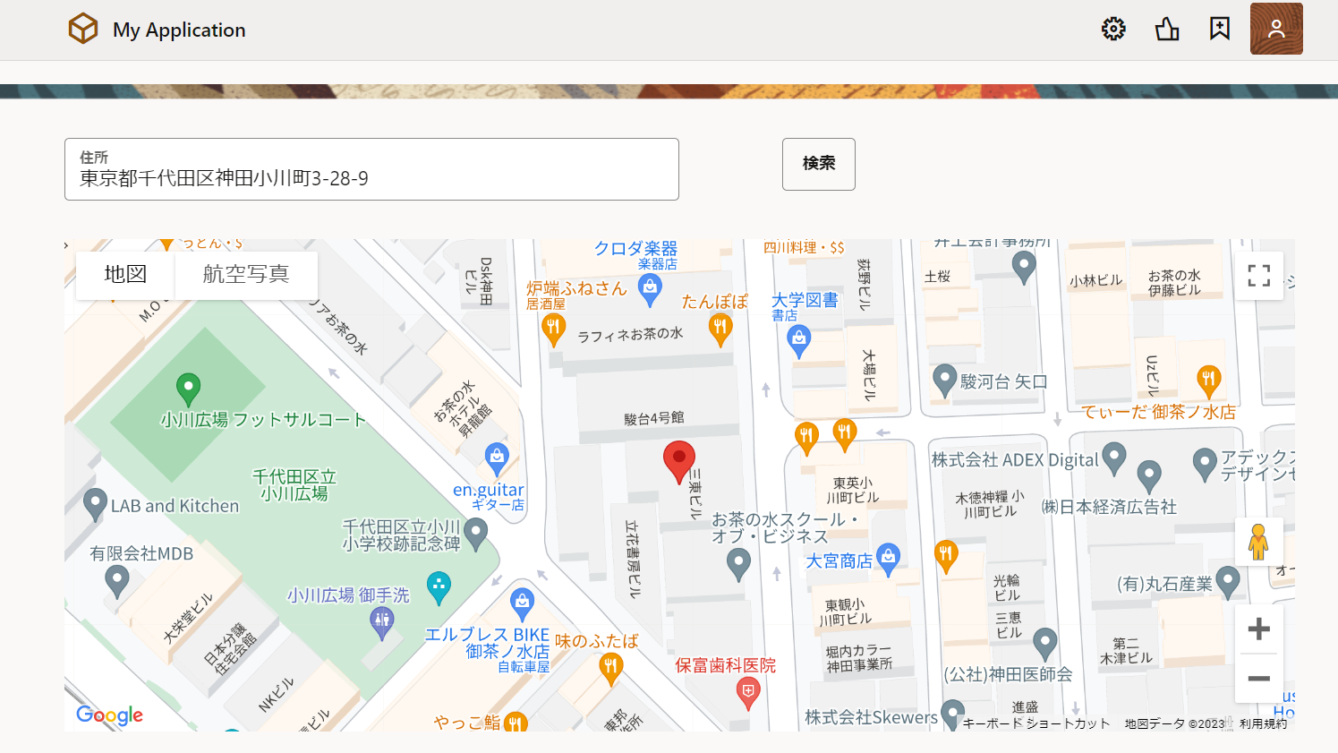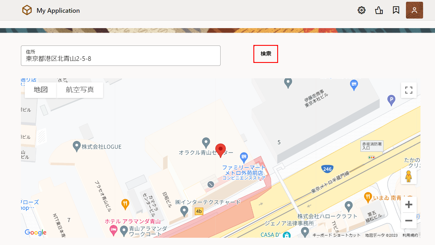 住所のテキストボックスに任意の住所を入力して、「検索」ボタンをクリックします。地図の中心座標とマーカーの位置が変更されたことを確認します。